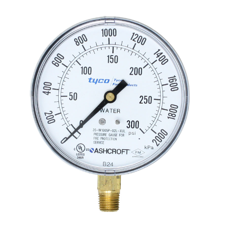 Ashcroft 1005P XUL Fire Protection Sprinkler Service Water Pressure Gauge, Dual Scale 0-300 psi & 0-2000 kPa, 3-1/2" Dial, 1/4" Male Lower Connection, Tyco 923431005, UL Listed, FM Approved