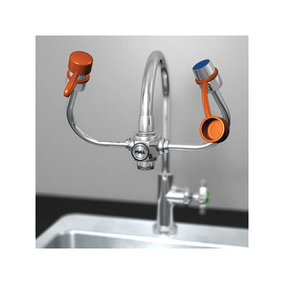 EyeSafe-X™ faucet-mounted eyewashes convert any faucet into an emergency eyewash station without interfering with normal faucet operation. An EyeSafe-X™ unit is ideal for use with gooseneck faucets and can be installed at any sink, close to where accidents might occur. In an emergency, the unit is quickly located and activated, and provides an unlimited supply of potable water for rinsing the user’s eyes. Outlet heads are mounted 5 in apart and deliver a soft, aerated flow of water. Heads angle forward and inward toward user. Angle of heads is adjustable to permit full coverage and avoid splashing. Furnished with float-off dust covers to protect outlet heads. Forged brass diverter valve. Pull knob to activate eyewash water pressure holds eyewash in operation, leaving user’s hands-free. Push knob or turn off faucet to return to normal faucet operation. Body has 55/64-27 female thread. Furnished with three adaptors (15/16-27, 13/16-27 and 3/8 in NPS) for installing on most commonly used faucets, including laboratory-type faucets.