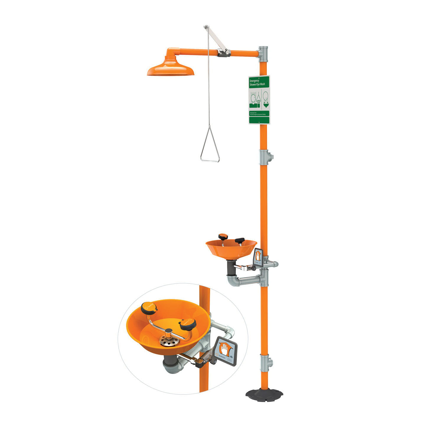 Guardian Combination Shower and Eye/Face Wash Unit, Galvanized Steel Pipe, ABS Plastic Eyewash Bowl, ABS Plastic Shower Head, 10 in Diameter Head, 11-3/4 in Diameter Bowl, 29 in Shower Handle Length, Stainless Steel Shower Handle, Floor Mounting, Specifications Met: ANSI Z358.1-2014, Orange, Galvanized Steel Fitting, Pull Rod Handle Operation