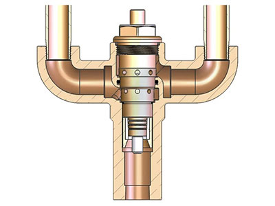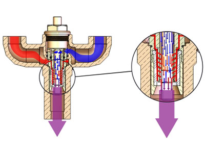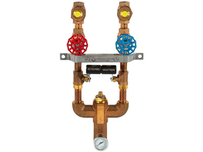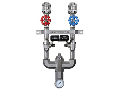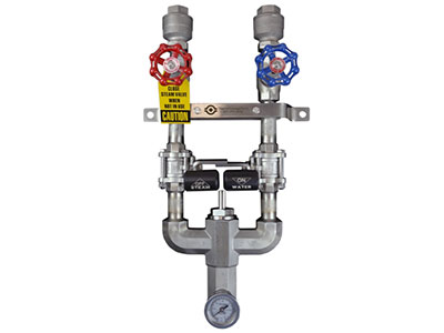 Operation begins when interlocked levers open the steam and cold water ball valves, allowing cold water into the upper chamber and steam into the lower chamber of the STVM Mixing Valve. Inside, the STVM Cartridge's spool feature allows the cold to enter the cartridge through small holes, while steam condenses into droplets and passes through even smaller holes. Then, the STVM Cartridge proportionately mixes the cold water and steam, producing a steady stream of hot water. A self-operating thermal actuator maintains the Operating Set Point (OSP) of the unit (typically 150–185°F) by reducing steam flow if it exceeds the OSP and fully shutting it off if the temperature rises more than 15°F above the OSP.