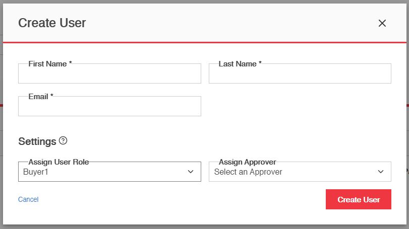 From the My Account Drop down, select the Manage User Roles option, and then click on the red "Create New User" button in the upper right of the screen. In addition to the standard fields, you will see a 'Assign User Role' drop down, where you can select which starting level of access you'd like to assign: a Requisitioner, Buyer1, Buyer2, Buyer3 or an Administrator. Click the ? to view a summary of what each role can do.