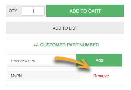 To delete a customer part number, return to the product detail page and click on the Add/Remove Customer Part Number button. Clicking on the Remove button found to the right of the part number will delete the reference.