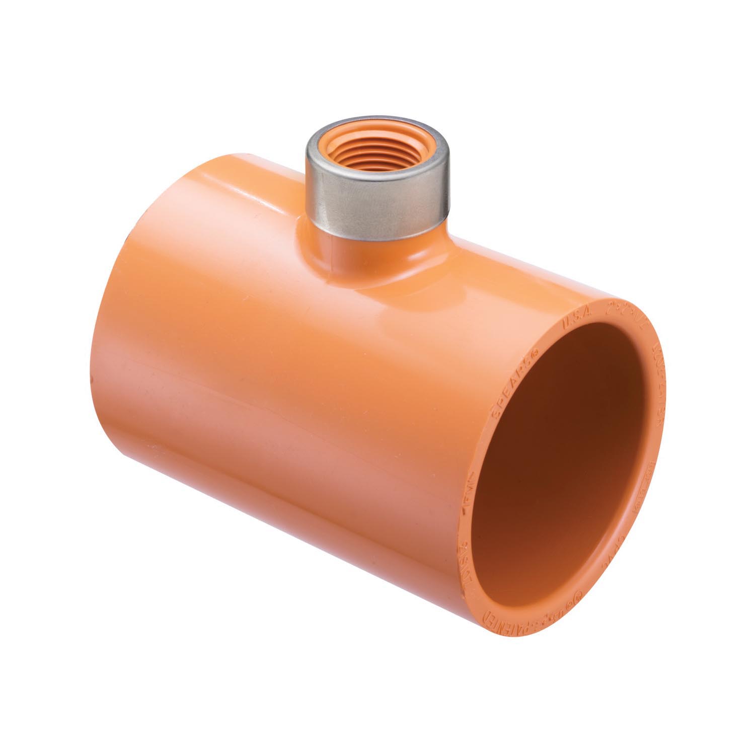 Spears® FlameGuard® Tee, Sprinkler Head, Fitting/Connector Type: Tee, 3/4 x 3/4 x 1/2 in Nominal, Socket x Socket x Special Reinforced FNPT, 3-7/32 in Length, Molded, CPVC, Orange, Domestic