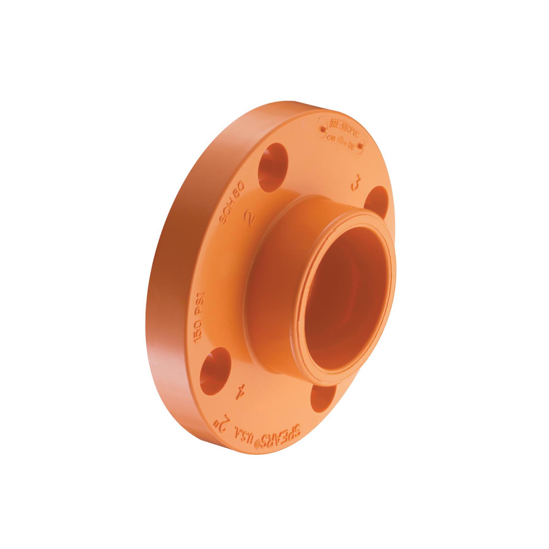 Spears® FlameGuard® Flange, 1-Piece Solid, 2 in Nominal, 5-31/32 in Outside Dia, 27/32 in Thickness, 4-3/4 in Bolt Circle, Socket, 175 psi, 150 lb, 150 deg F, CPVC, Orange, 1-27/32 in L, Domestic