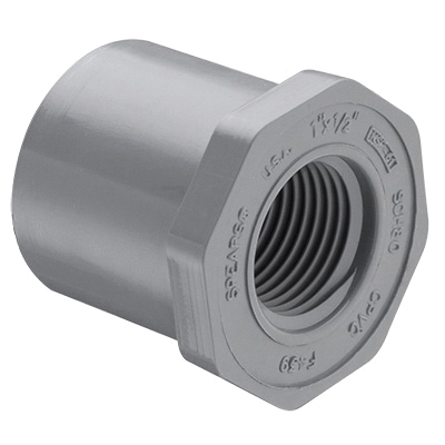 Spears® Reducing Bushing, Flush, Fitting/Connector Type: Bushing, 1 x 1/2 in Nominal, Spigot x FNPT, 1-11/32 in Length, SCH 80/XH, Molded, CPVC, Gray, Domestic