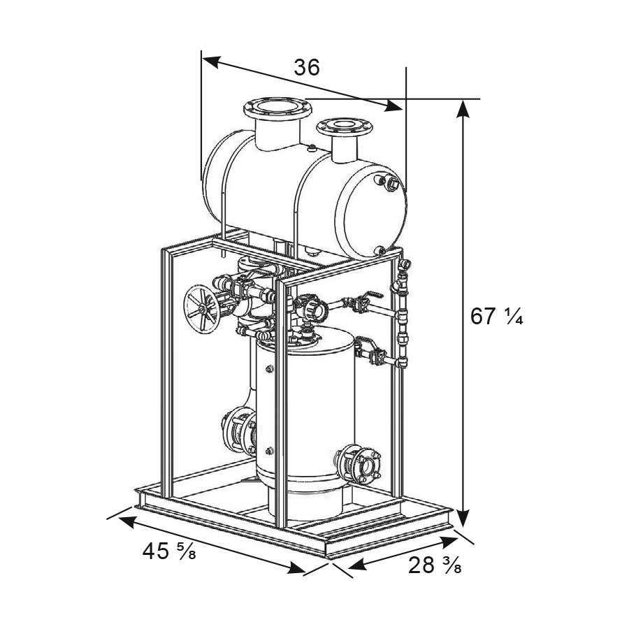 Spirax Sarco The Pivotrol® Powered Pump Package, Simplex Vented Pressure, Series: PTF, 90 gpm Flow Rate, 2 in Inlet, 2 in Outlet, NPT Connection, 200 psig Maximum, 31 gal Reservoir, 400 deg F, Carbon Steel Body, 45-5/8 in W x 28-3/8 in D x 67-1/4 in H Dimensions