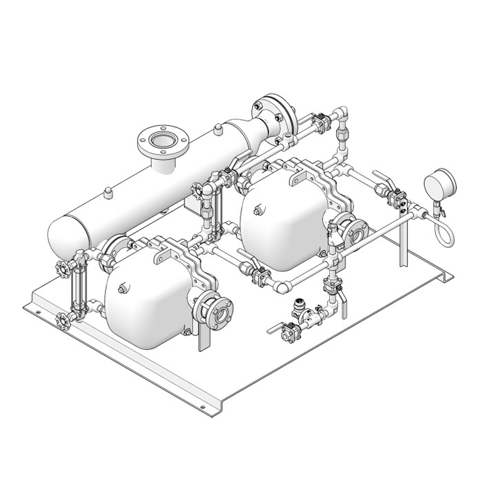 The compact low profile modular pump/trap system consists of the versatile APT10, APT14, APT14HC and APT14SHC automatic pumping trap pre-piped and mounted on a steel base. The simplex or duplex modules include a condensate reservoir sized to accommodate the pump cycles. The module requires only service field connections for complete installation and fast startup.