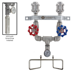 The HCX is a hot and cold water mixing Washdown Station designed to provide a high-temperature wash for production facilities that do not have an existing steam supply readily available. The HCX station uses individual globe valves to mix hot and cold water to the desired proportion with the outlet temperature clearly displayed on the integrated, easy to read temperature gauge. The HCX station is available in stainless steel or brass/bronze construction and can be ordered with the SmartFlow safety shutoff valve which will reduce flow should the outlet temperature exceed the factory set point and shut down 10 deg F above that with a minimal amount of leakage.